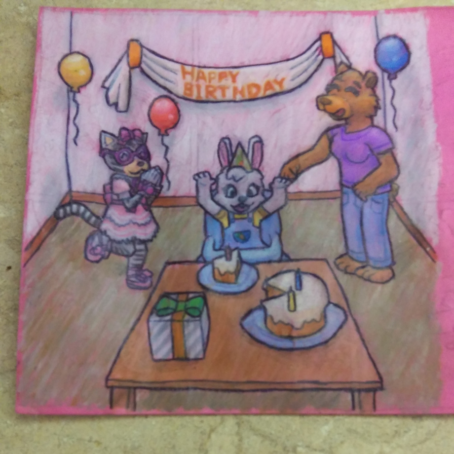 Sammy and Stripes give James a yummy carrot cake with three candles.