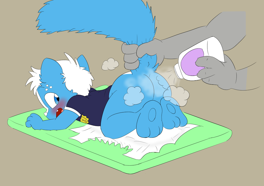 this is the sequel from an old pic i've got from my first tato stream, and that i posted here: https://inkbunny.net/s/1916975 . gonna upload this pic only here on IB and on pixiv, as i use these as my mature base. ------------------- It took awhile to the skunk notice what's going on, but once he got his pikachu undies taken away from him, he noticed the nurse grabbing a diaper. He tryied his best to turn around and run away, but the nurse was faster than him, grabbing him by the edge of his tail, lifting it up, and powdering his bottom.