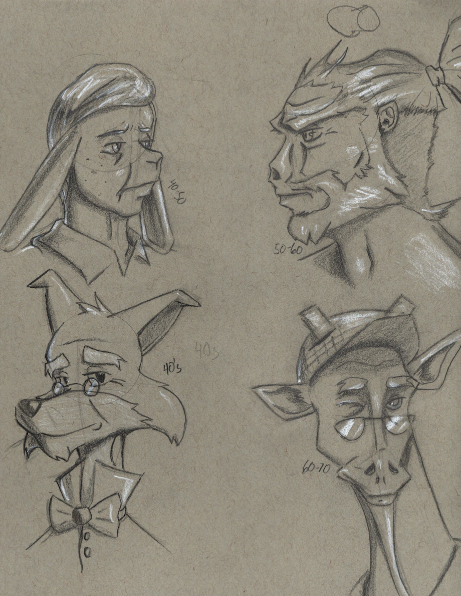 It's good to see some elder furs. Handy thing to be able to draw for creating a family of characters too. I like the bottom two best, as they look the least human face wise. The giraffe is a rarity, too. Don't see those often. Fox guy looks handsome there. Rabbit on top makes me think of characters from Arthur cartoon on PBS. Other guy puts me in mind of gannon in newer zelda games. Overall, they do look elderly. Good job : )