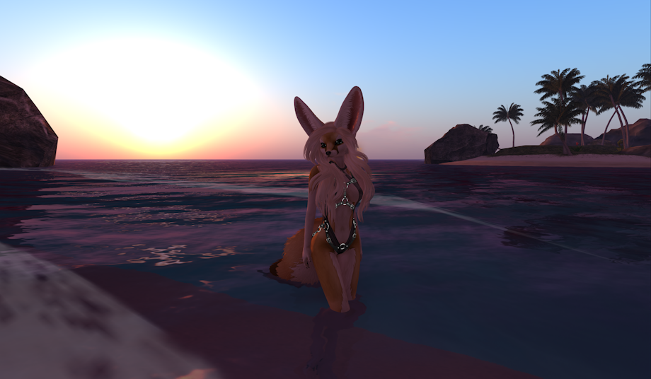 Just my lovely fennec fox sweetie showing of her sexy one piece swimsuit and harness at sunset in Second Life.