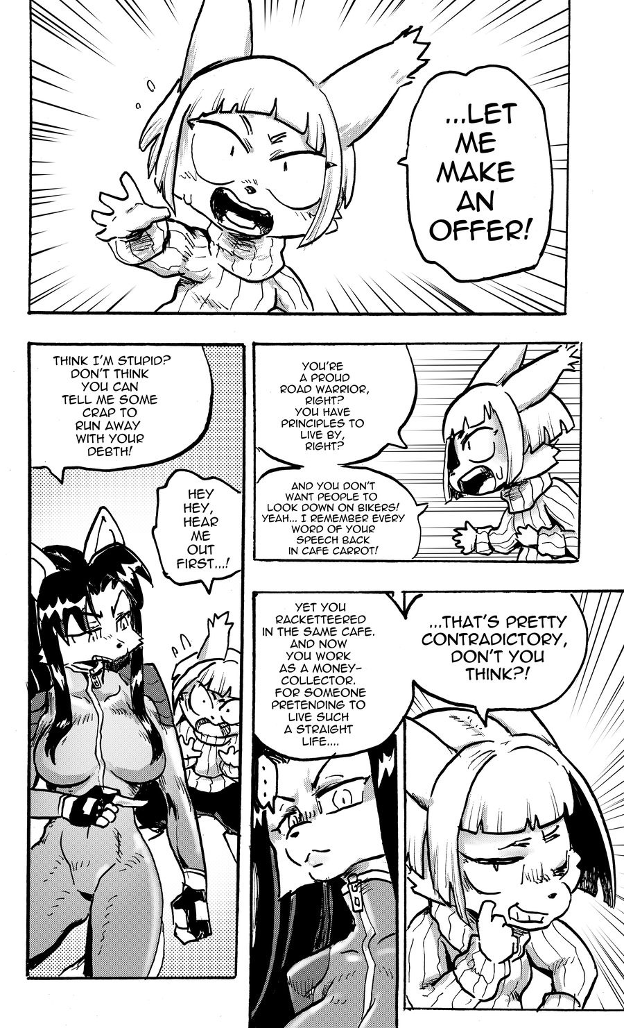This chapter is extreme. I like how Kalita beats Muko with a single blow, pretty much breaking that stereotype of friendship and love allowing underdogs to defeat rivals who surpassed them in strength and skill. Kalita having a lightning punch shows she's probably a pro-level fighter as she's the only character so far besides Nyarai and her fire kicks to have elemental attacks, meaning there's some sort of skill gap to cross in order to get such level. I am curious about the Tendonchi championship, especially since Muko needs to complete three trials before she can fight in the tournament. Props for Cookie and Shun for training Bolouma and Skully, as the former built the base for the fighters they became and the latter turned them into champions. I feel bad for Kalita quitting her gang since it meant the world to her, and now she has to go against her principles to make a living. While her becoming a Combagal is bound to happen, I can see why she's resisting with her arguments. I'm dying to see how she gets convinced to join Cookie and Muko. Finally, that Snuggly commercial killed me, lol. Until next chapter.