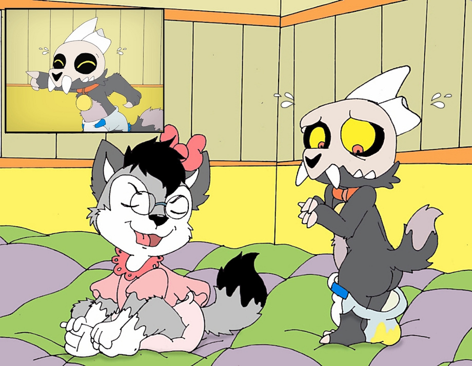 Surprise gift art by Nelson and Victor (thanks them again) after I suggested Nelson should do a picture of King from the Owl House ( https://theowlhouse.fandom.com/wiki/King ). The character in question is treated like a baby puppy in the show, and I'm not making it up. I haven't finished the season yet, but he has been seen eating from an high chair, moved around in a baby carrier, and modelling baby clothes... which is rather amusing since he is voiced by the boyfriend of the creator of the show. Any baby / mommy relationship here feeling here ?