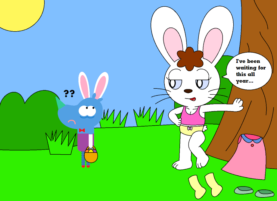 My wish came true! It's Easter Day! It's a picture about Tag from Hey Duggee in that Easter bunny outfit for girls, and ladies/women and he is scared and curious to see Mimi Rabbit from Adventures of the Little Koala in her underwear model.