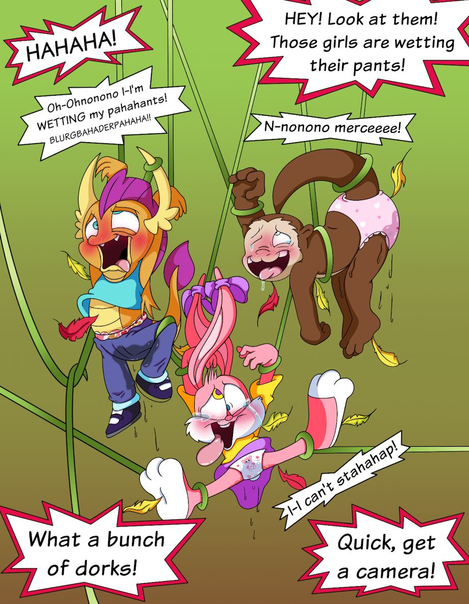 Babs Bunny, Smolder, and Ottoline are being suspended by vines and tickled by mysteriously floating feathers in front of a large crowd of people exploring the forest with them for a public event. No one believes this place is haunted so the act of being caught in vines and being so sensitive to these feathers as they flutter down has to be their own fault right? In fact, those feathers look more like autumn leaves don't they? Yeah, that's probably what they are.