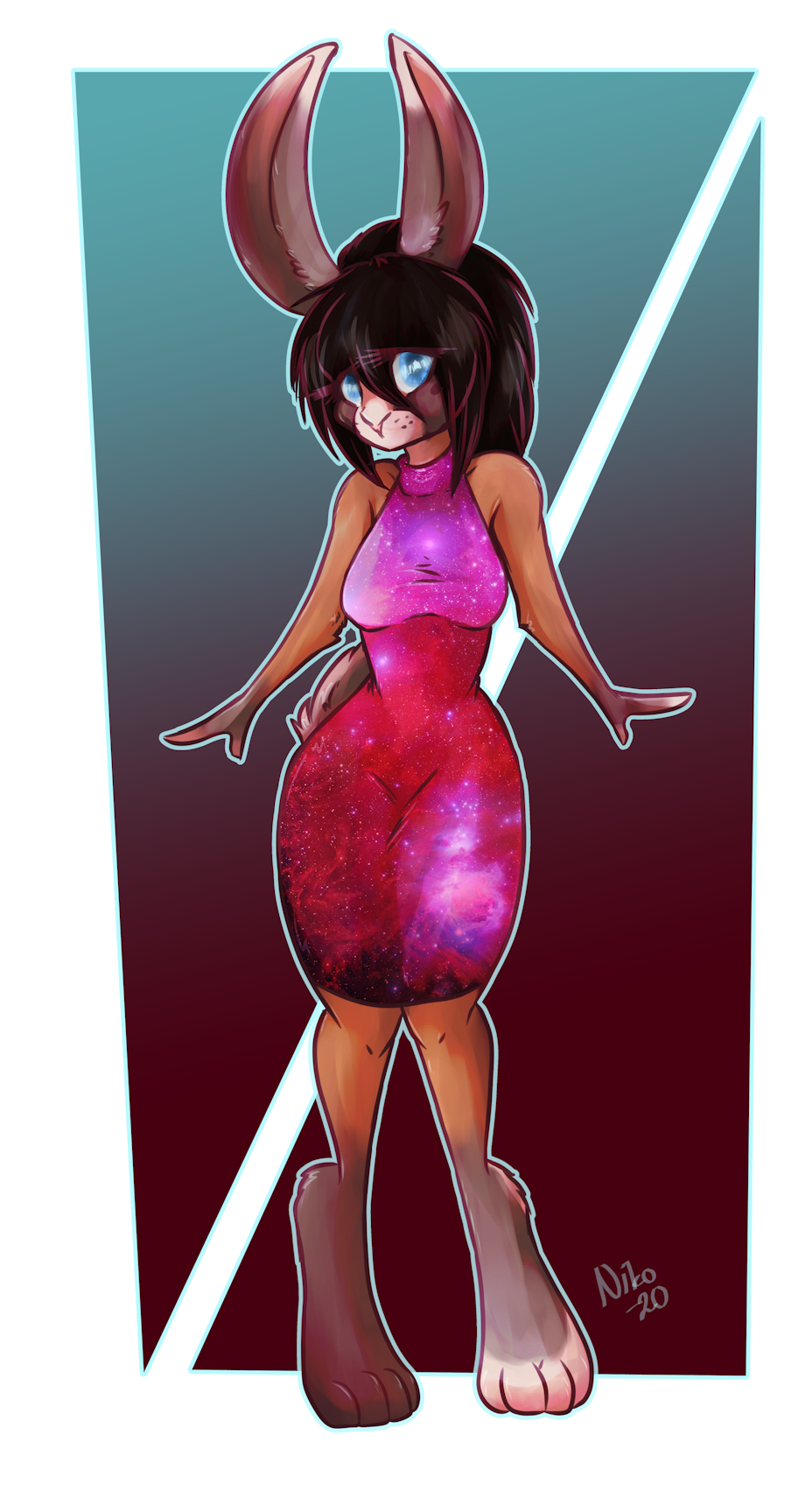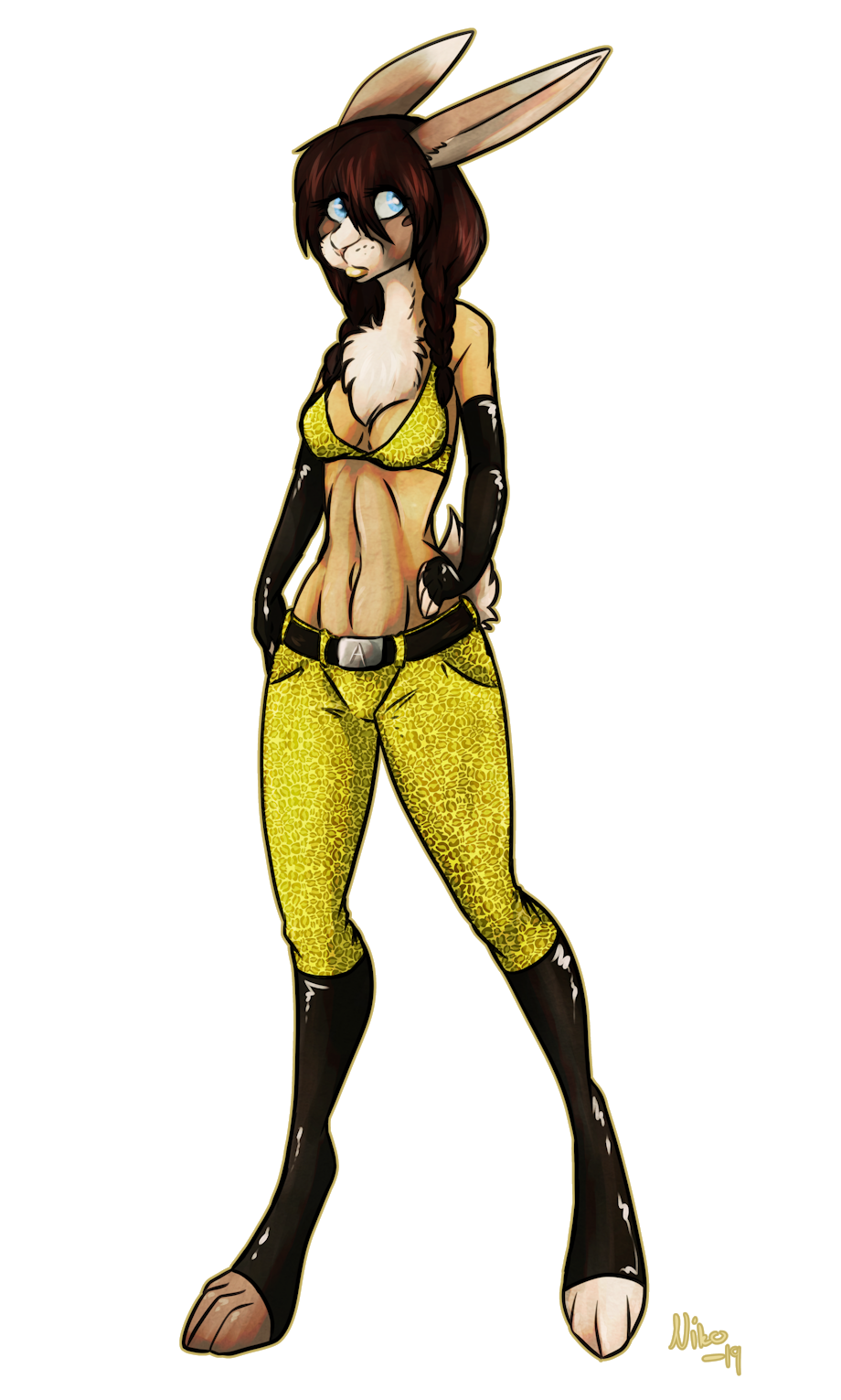 Hourglass shaped body with standing ears, wide hips and c-cup breasts. Long legs and big rabbit feet. Has a mole under her left eye and a slight overbite (bit wabbit teef ya know) that she consciously hides.