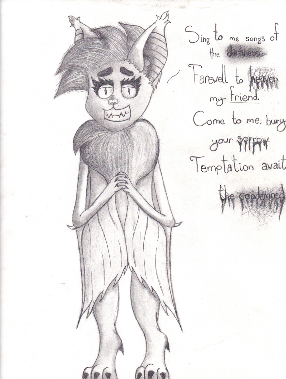 Again, trying to keep this short, but it's kinda hard because what you see here is a character; her name is Rhapsody the Bat. At least, what you see is the culmination of years of obsessing over her after originally finding this character on Flipnote Hatena drawn by an artist named "Darkbunny" at the time but I believe shortly before Hatena ended, she changed her name and made it actually impossible to find her only knowing this and maybe her real name was Samantha or just Sam and the main reason why I have been trying to find her-...*sighs* This character, drawn and animated to a nightcore version of this song (which I believe was a popular animation meme at the time), was among my first ever furry crushes, forming in me feelings I had no clue what to do with at the time but definitely helped lead me in the direction of finding out who I really am. She is definitely to thank for me being a furry, and her artwork has inspired me to draw; I mean, just look at this! She did not look like this on the DSi, I can assure you of that! She was a chibi-style character with much less detail and, even, my first attempt at "drawing" her was me actually putting paper against my DSi screen and tracing her because I wanted to keep her in mind, and from those tracings, I drew her and a couple of other characters (named Rye the Albino Fox, Devion the demon fox, and Angeon, whom I don't think I drew but was among her lore) until eventually improving my skill enough to make this! I have search for many years to see what became of her after Hatena closed and I have found other Hatena artists, ShinyEevee (now named Pupom), Yuna1997 (I believe was the number), Pocho, I've found other Flipnote artists whom I used to watch on Flipnote Hatena, but this mysterious Darkbunny character still alludes me and it has been the most frustrating, actually physically depressing feeling I have ever held with me, and I know -- if for some reason you, or anyone!, is still reading this -- this probably all seems weird or like some weird obsession -- it is! It's an obsession for this Rhapsody character whom I actually fell in love with at the age of 13 or 14 and shaped me into who I am now and the desire to find and thank the original artist involved. God! You guys didn't see the original animation where she came from and this particular still image, this one nor the other one of her and Devion set to a different equally haunting song when paired with the image that just provoked some odd feelings I was far too young to understand but GOD did it resonate with me TO THIS DAY that I might actually start crying if I keep typing!