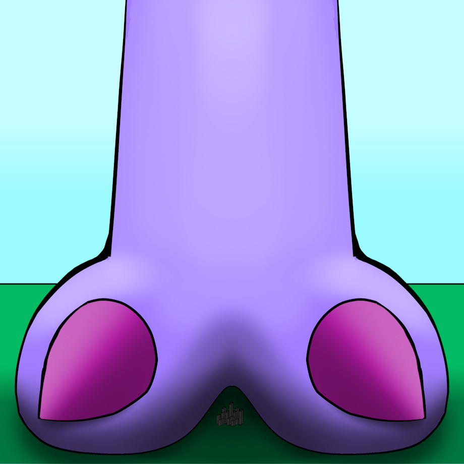 "Heh, this is where this microscopic city belongs, I see! I might move a little closer and relocate you into the crevices of my foot~" This isn't even his first city of the day, probably not his last either! Must be like a planet on his sole by now!