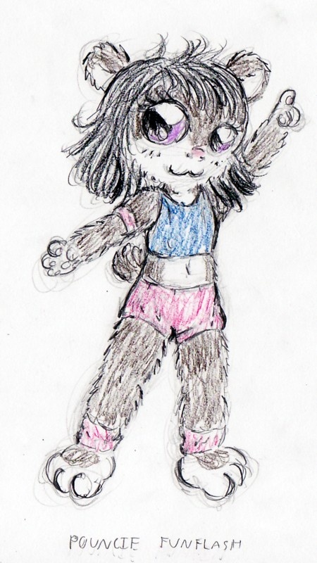 This is Pouncie Funflash, a wild tomboy bear girl. Her athleticism is greater than any of the other cubs, and she likes to playfully jump upon them in greeting.