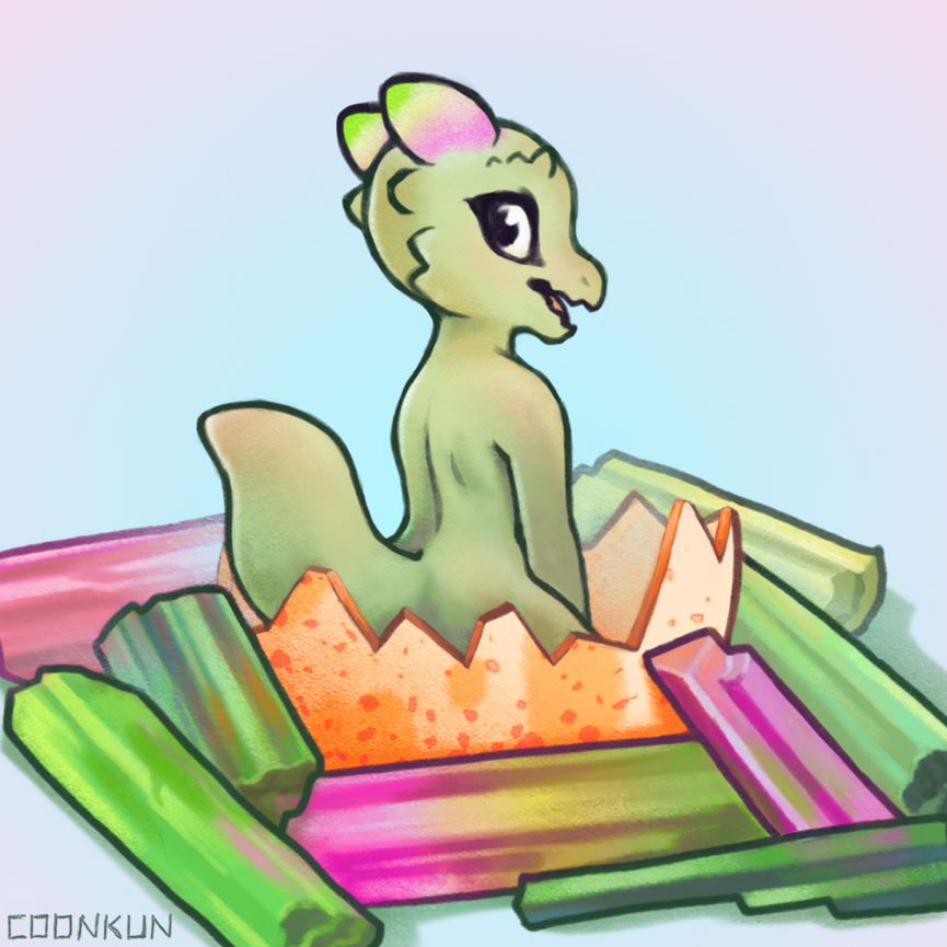 The Crystal Kobolds become attuned to specific minerals when their eggs are nested among samples of the material. This is believed to imbue them with magical abilities and special qualities. Here is baby Tourmaline with her namesake.