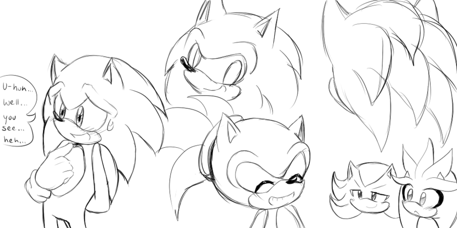 don't know why i gave him a ponytail but i might do an actual pic like that but there you go. since i changed the way i draw shadow's quills a bit, he should be easier but i think i need more work on silver. his ears to hair thing kills me....but yeah, here's sonic