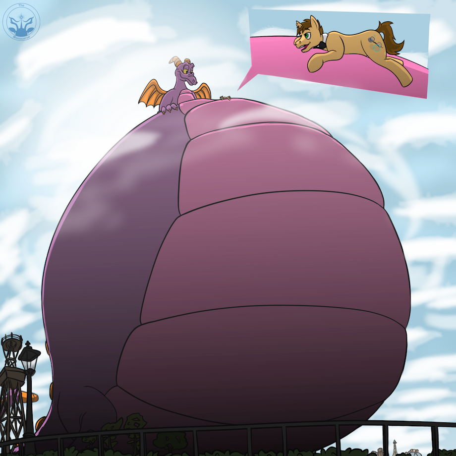 This is a birthday gift I made for bobby165324 (FA). His character Bobby is having a nice time lying on the enormous belly of Figment, who has gone to the middle of EPCOT's World Showcase lagoon and inflated himself to be huge since he knows what Bobby likes.