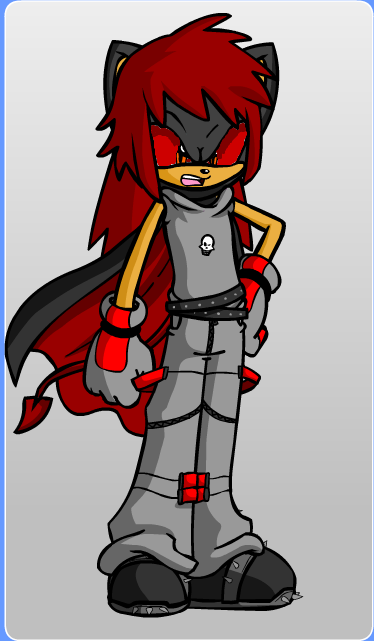 Julius is a dark entity, black fur, dark skin, a devil's tail, long red hair, and orange eyes with red sclera