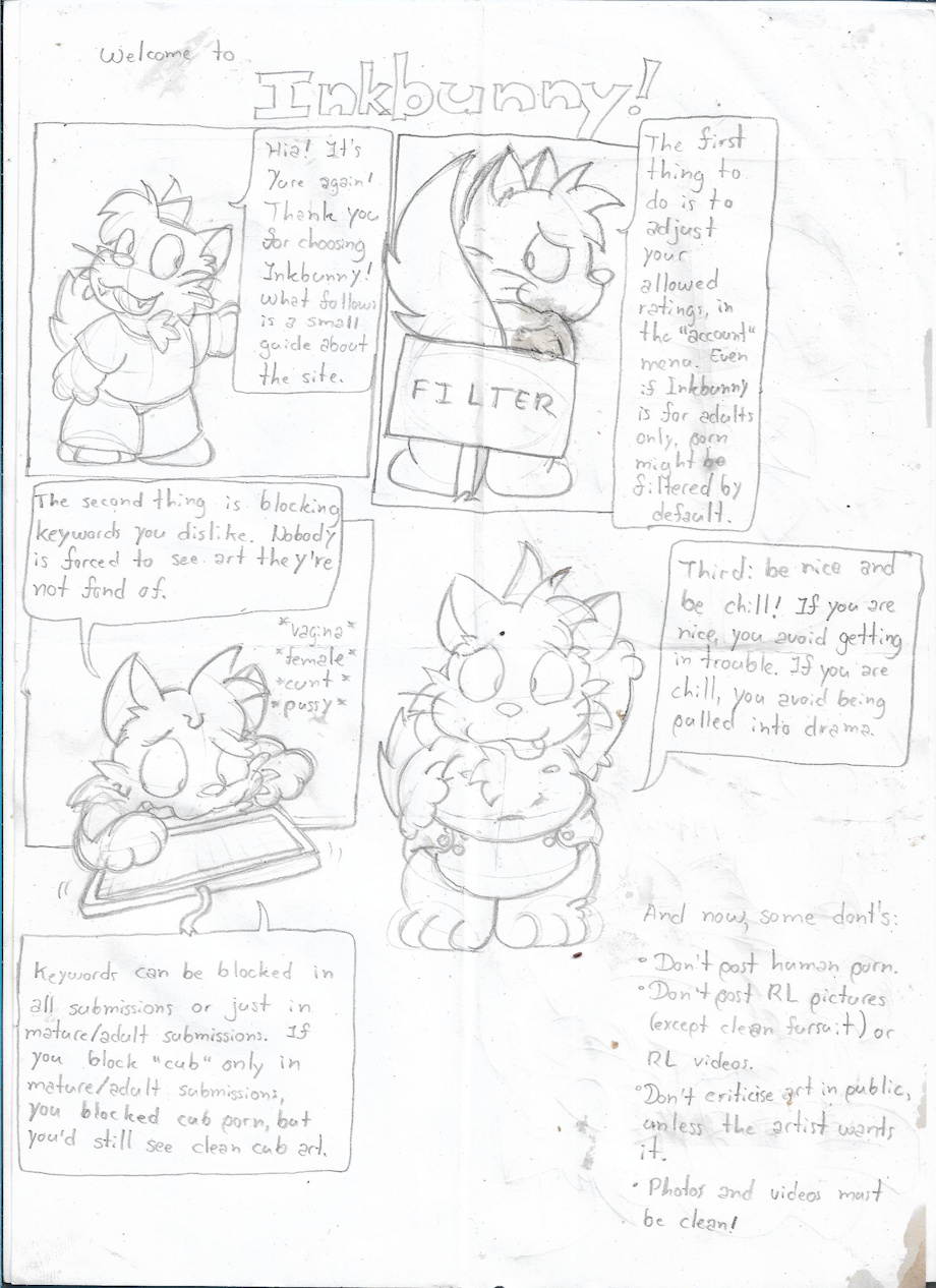 This was a project I came up with, but that I might not finish. It was supposed to be a comic introduction to Inkbunny. I decided not to continue.x3 Too much work. But you at least have this page.