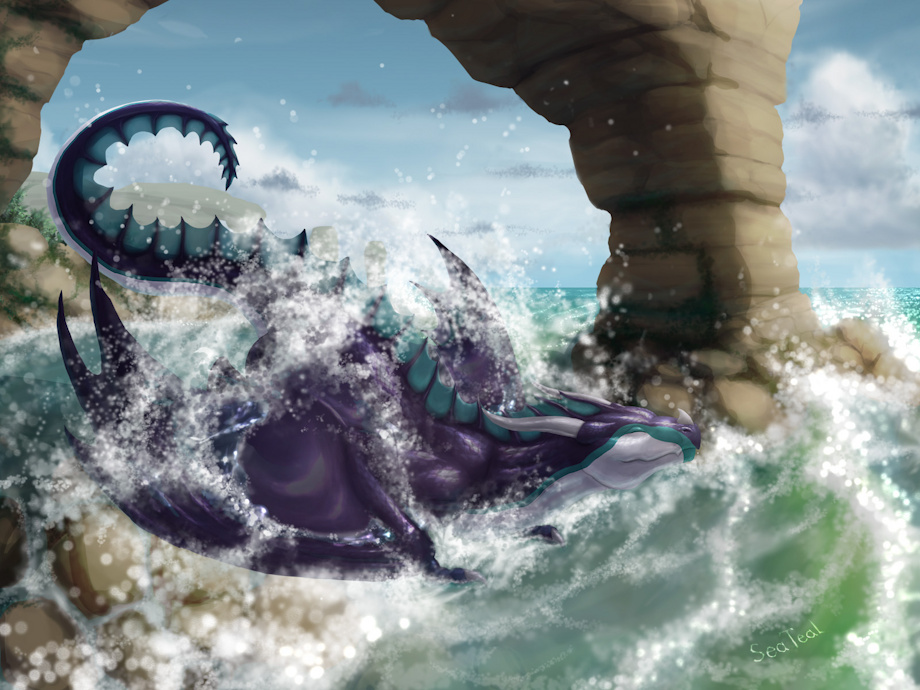 This wyvern likes to go to this coast where waves can get really splashy, especially in alcoves like this, a nice all-around wash!