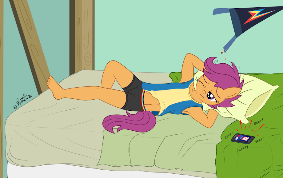 The former looks like her groggy and half dressed and the latter like her PJ's! Get up Scootaloo if
