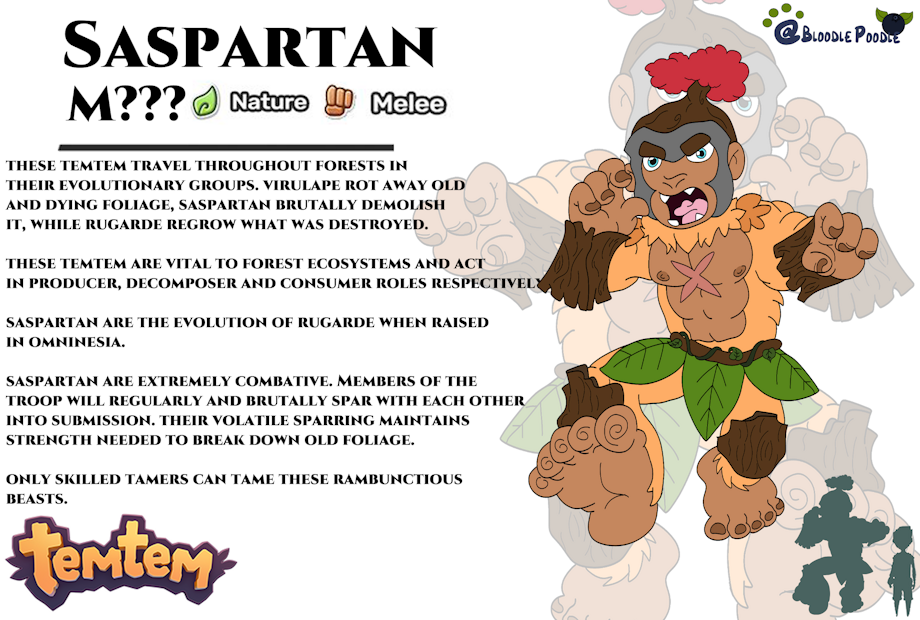 I made it in time for the monkey tail-end of APEril. Here is the first of two split evolutions for my fanmade sasquatch Temtem Rugarde, Saspartan. He is a nature and melee type powerhouse who delivers quick punches and kicks to incapacitate opponents.