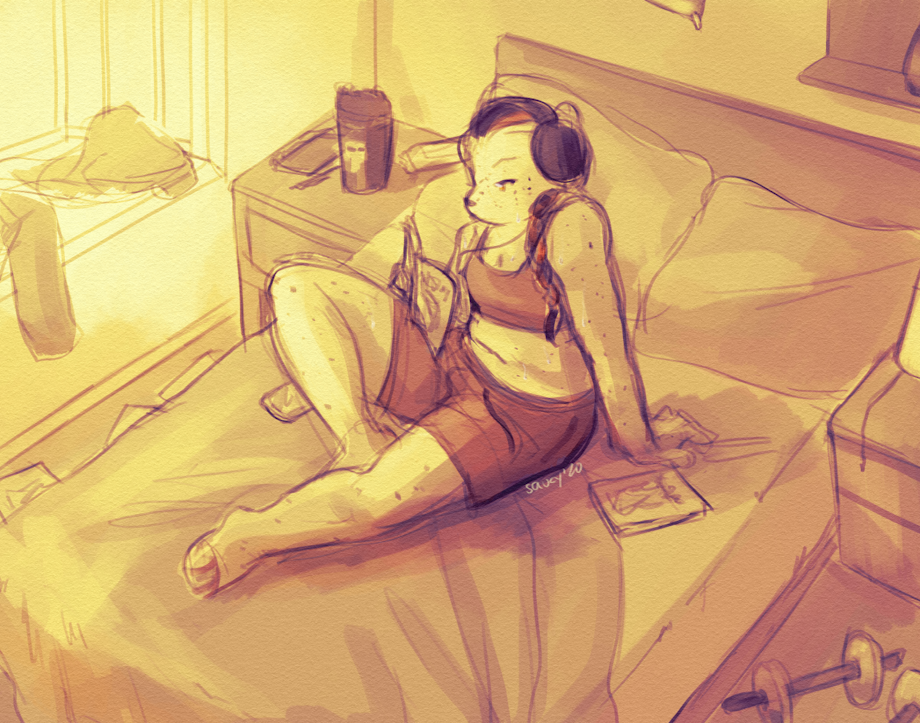 “50!” I slowly lowered my arm and dropped the weight on the floor as soon as it got near the ground, a muffled thud shook my nightstand a little, causing the dark-red boom box to shudder in protest. I let out a sigh of relief, wiping the sweat off my brow as I reached over and took a swig from my canteen. The cool, smooth liquid flowing down my throat, giving me some much-needed relief from pumping iron for about- what, 30 minutes? Forty? I lost count. That doesn’t matter anyway. Stretched out my sore, honestly rather long arms above my head for a much-needed stretch. I could feel the exhaustion travel up my arms into my fingertips, making me rather sleepy. It felt amazing. After I finished stretching, I flicked my braid out from over my shoulder and caught a glimpse of a little picture of my partners and I on a date at one of the local skate parks. I smiled lightly. What a fond memory. A memory that was slightly buried under some popular Korean adventure magazines. You know, the ones with the amazon women and the buff super-hero Lady that always gets the girl. Things like that.