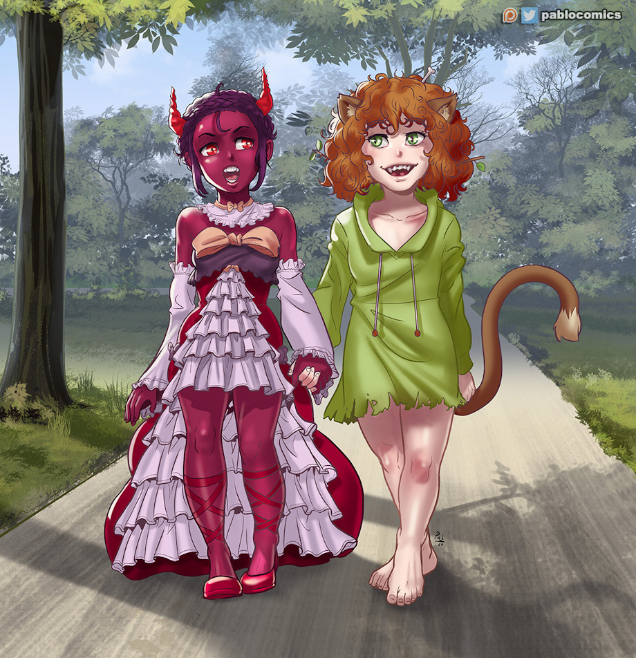 Two friends walking on the park. Something that we can't do, so technicaly that's a High-fantasy themed drawing. Commissioned work.