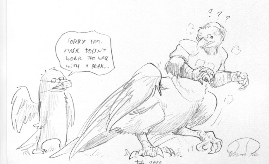 Someone on the football team must have had the virus, because Pheagle caught it in the middle of practice and transformed into a raven taur! At least it's not Covid, but now he can't wear a mask!