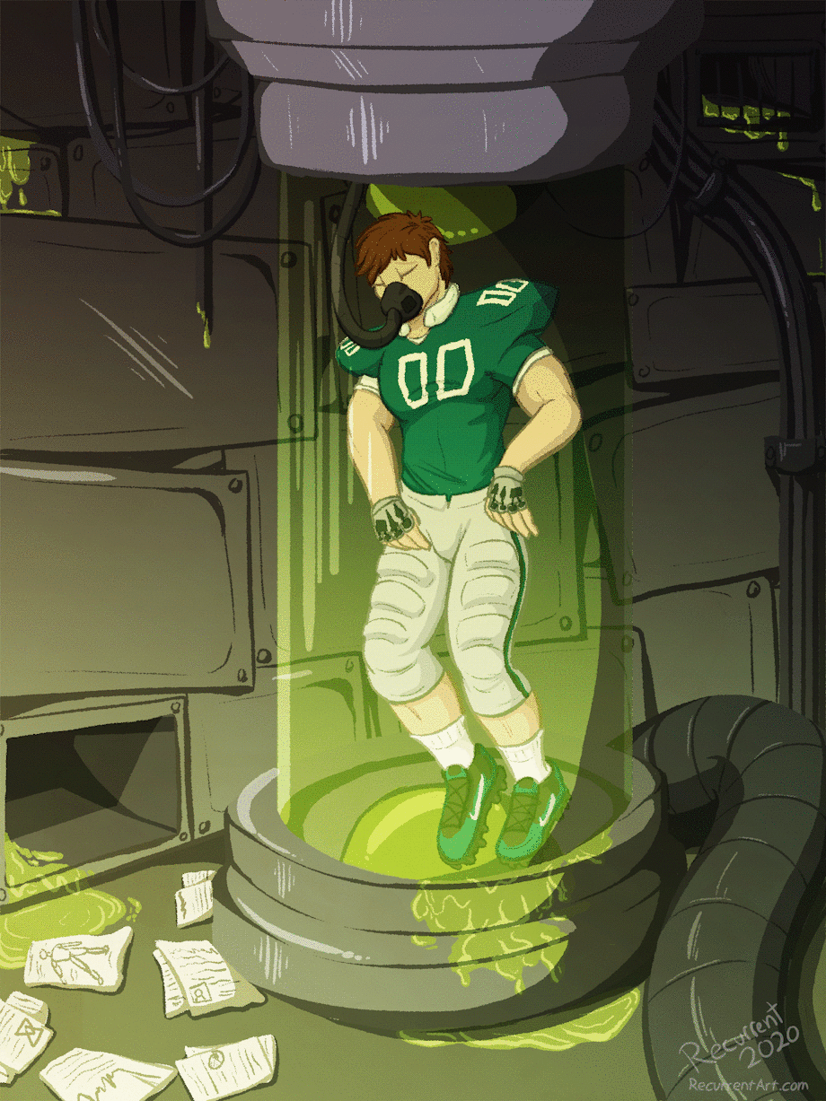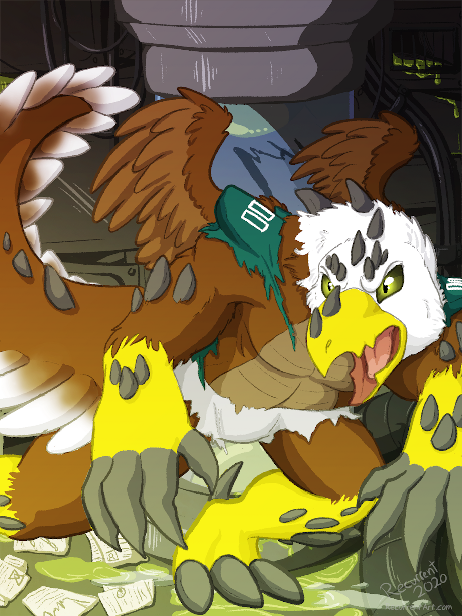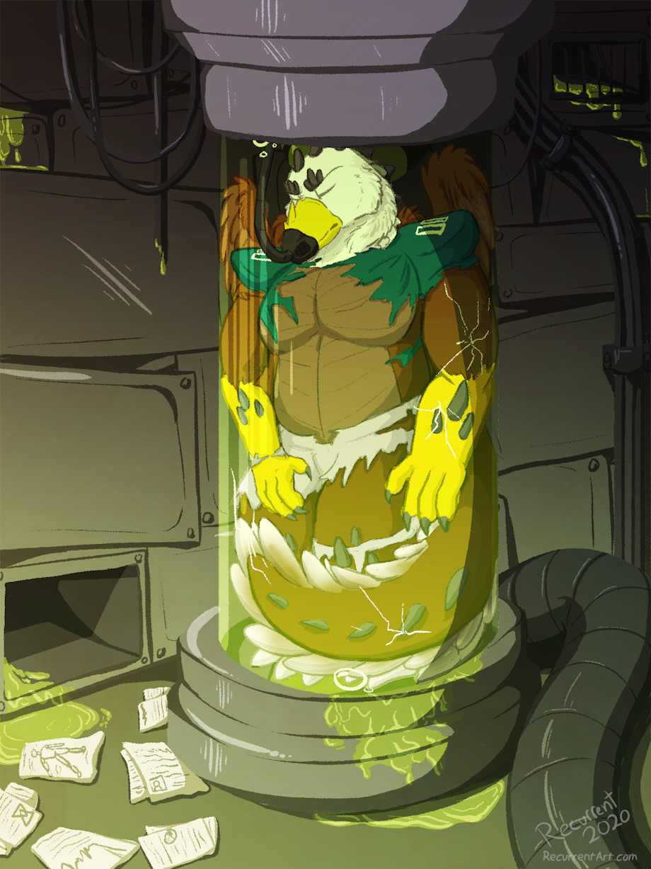 Pheagle, now an anthro eagle-kaiju, is scrunched up against the inside of the tube, his football uniform all but completely destroyed and cracks are starting to form in the glass! I've got a bad feeling about this!