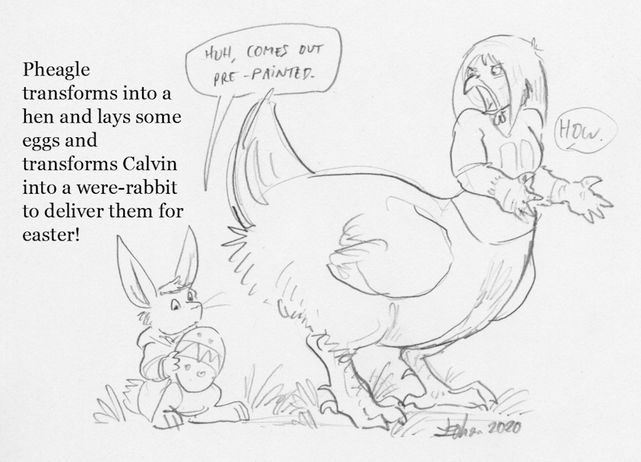I turned into a hen to lay some eggs for Easter, but I needed someone to help deliver them so I turned Calvin into a rabbit! Also it turns out the eggs I was laying were already pre-painted! I wonder how that happened!