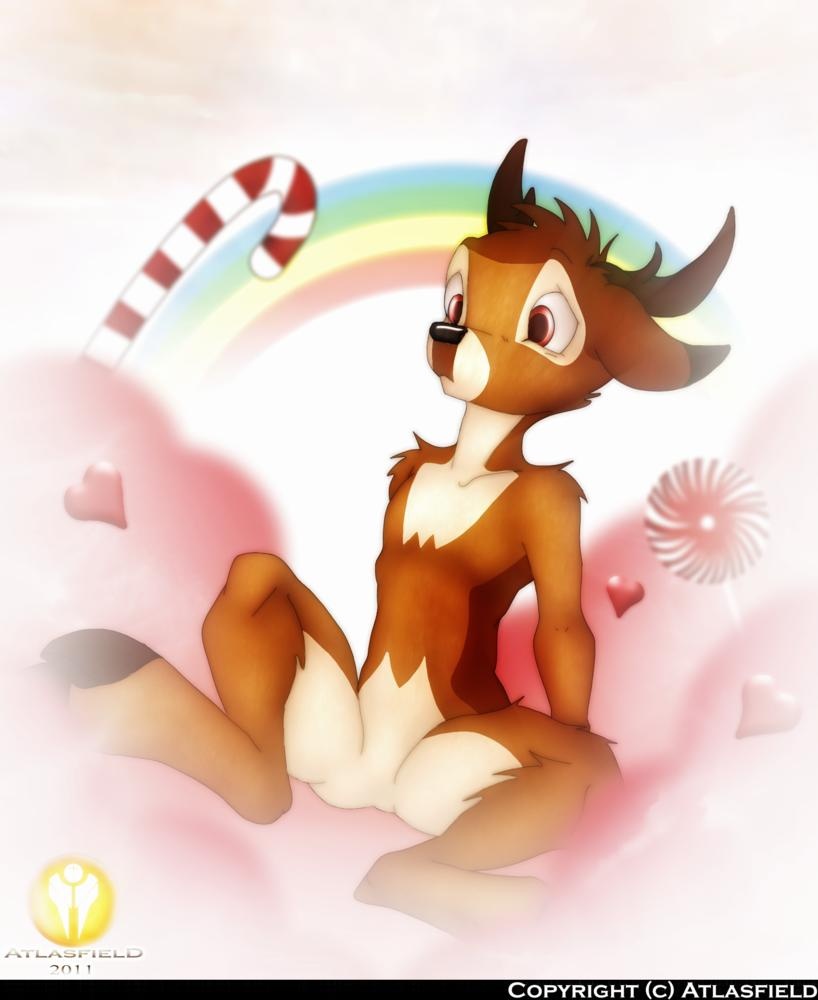 Someone suggested me a time ago draw something stupid, Bambi, or any character around a place full of candies, pink clouds and rainbows... there is the result, the first time I draw a rainbow.x3