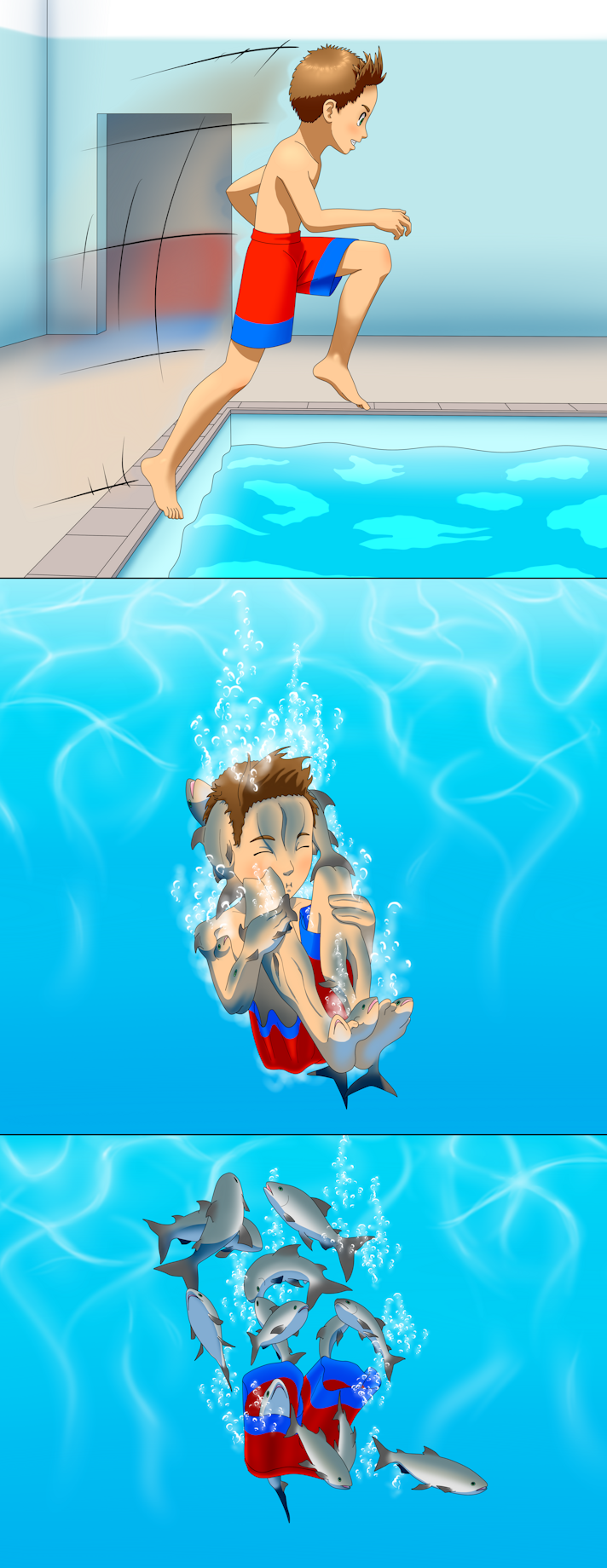 Previously we saw Cal, slide into the pool, turning into water on the way down. Now Nick joins him, dive-bombing into the pool and splitting up into a school of fish. The only issue now is how to get all the Nick-fish out of there when they don't want to get caught?