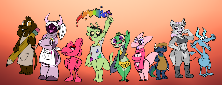 A lineup of all of the contestants for the Drawfriends mascot contest! From left to right: