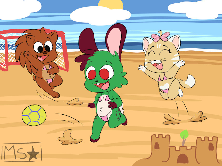 My bunny playing soccer on a beach with two cuties.