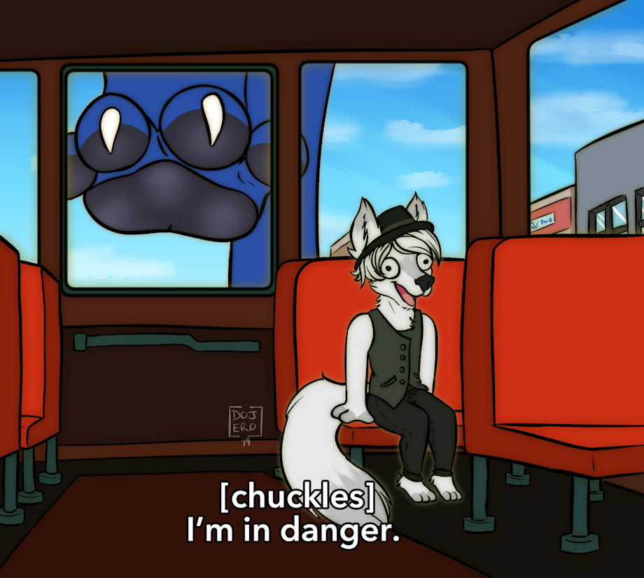 A derpy little YCH that Dojero was doing based on Ralph Wiggum clip in the Family Guy / Simpsons crossover Playing the part of derp on bus in danger: Dark Playing the part of impending stomping danger: Ladrona