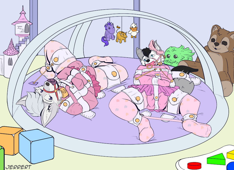 So, Rex invited Lubu's princess to have a playdate with his own, Tommy. Seems he was well equiped to entertain the two little ones with one really special activity mat... not much range of movements at all... and only hole to have any time without their chastity belt, they need to hit those toys multiple times... Guess the two princesses have a big job ahead of them to get any pleasure today. But they are sure particulary adorable like this...