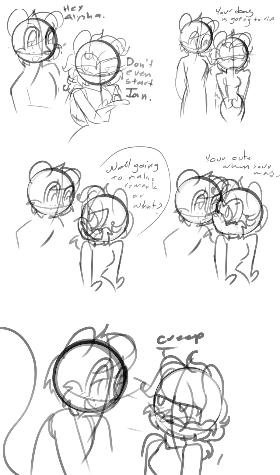 It's not much and don't know if I'll really finish these, but here are some very messy sketch comics of Alysha and Ian interacting with each other.
