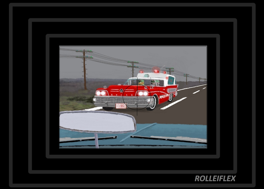 When oldest son Jed got the picture of the ambulance, he was lucky to get the timing just right...Marge was driving at 70 mph, and the ambulance coming the other way was travelling at 100 mph. Now for Jed to get it just right like that at a combined meeting speed of 170 mph, how lucky was that? And it was fortunate that Marge had picked out high speed film so the camera can be set for a high shutter speed...And a Rolleiflex camera does get high quality photos. Had it been a slower shutter speed and a cheaper camera, the picture of the ambulance would have come out blurry.