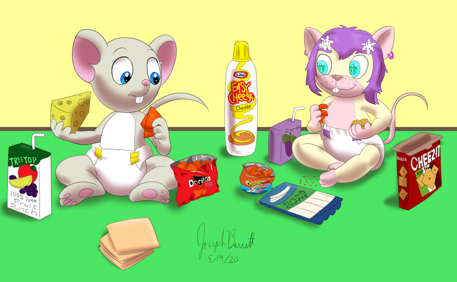 Rissa Rat & Oliver Mouse enjoying some cheese and cheese flavored snacks. With some Grape Juice for Rissa & Fruit Punch for Oliver to wash them all down.
