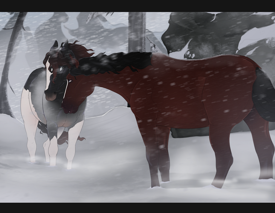 Some mares sheltering against the cold blizzard