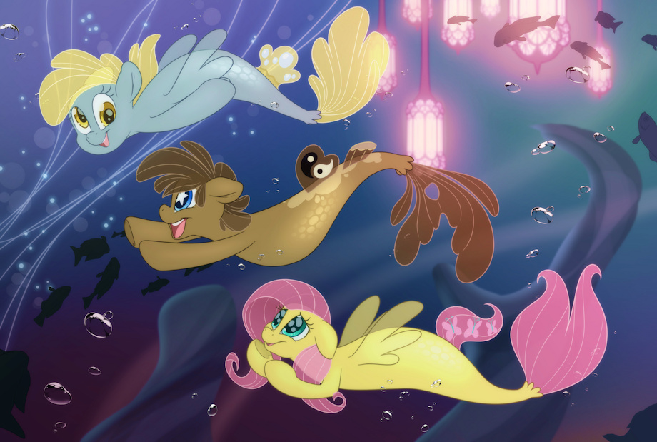 Anyway this was obviously inspired by the seapony parts of MLP: The Movie. I drew Derpy getting a chance to explore the underwater world with Pinkie Pie before in my piece "Ocean Mares", but Spirit deserved to have soem fun getting to swim with his own set of fins, and accompanied by his favourite ponies in the world X3