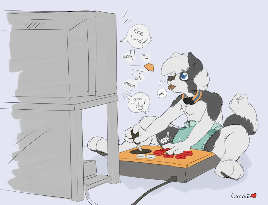Games for halfies are an emerging market and Russel loves this one. It's a quite nuanced sheep-herding title, but maybe it's the messaging that really keeps him engaged. Mom's set him up on the spare TV and with ample padding he'll "stay" for a few hours racking up a new high score. Next time she'll set out a plate of milkbones and a puppypad to go with his halfie-adapted controller.