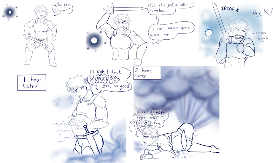 "What's that? A potion of cure disease?" He laughs, another droning of wind matching the sound as his body shook. "You think I haven't tried that? First of all, this thing isn't a disease, it's a living thing inside of me. Second, these little guys feed on magic." He slapped his stomach, prompting another thunderous burst. "The only thing that would do is give them more fuel to convert into gas."
