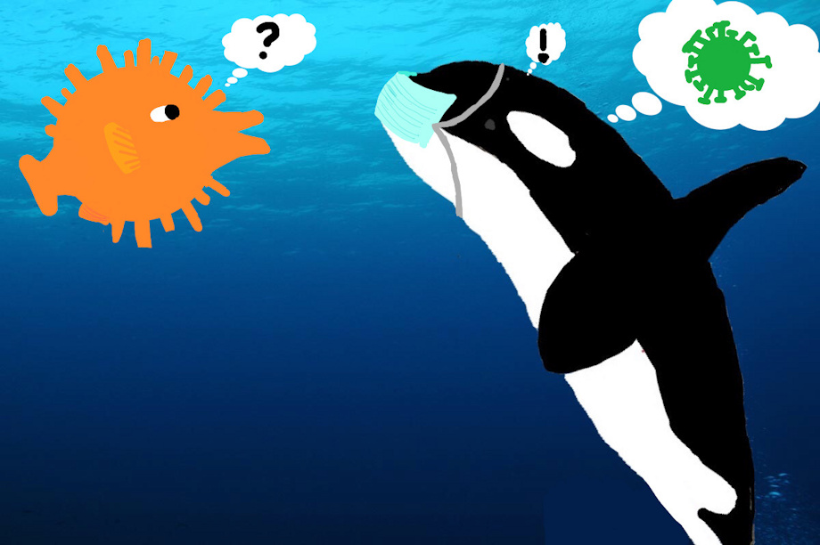 I drew this wile under shelter in place due to the activists planning to loot neighborhoods near me. I decided to play with some humor. In this picture a orca thinks the puffer fish is a covid bug. Hope you guys find humor in it.