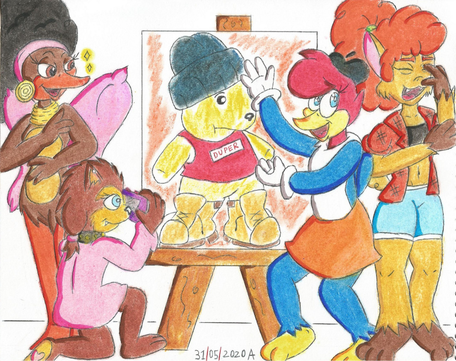 La historia es que Winnie Woodpecker le esta enseñando a su nuevo grupo de amigas sus dotes artisticos dibujando al primer ministro de China en su ropa casual, eheheh.