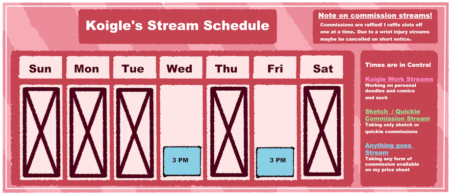 Trying to take it really easy, A not about the streams My doctor suggested to work no more than 2 hours at a time. So, I will most likely only being taking one slot on stream days. But! If I do take more than one just be aware that I have to take about 30 minutes after two hours of work. I will try opening off stream commission slots next week. But I will only be taking 2 slots.