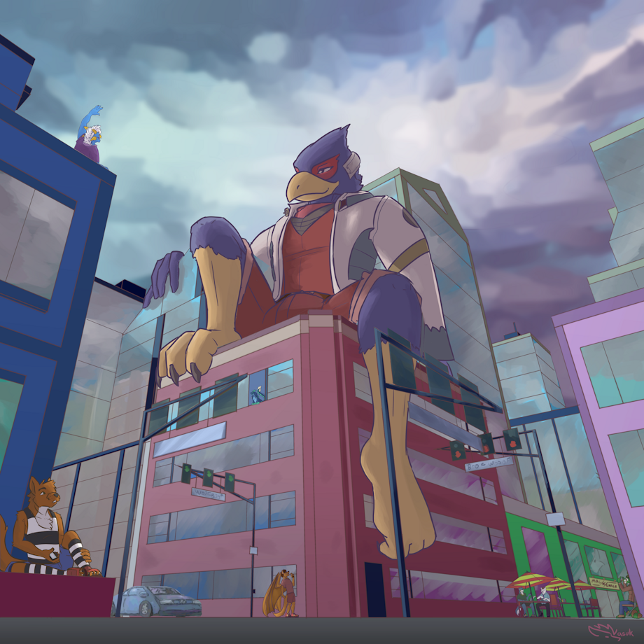 Macro Falco is sitting on a building while micros are welcoming him.