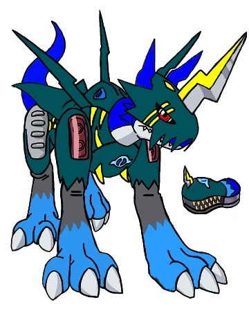 Instead of Black armor he has Dark Cyan which sorta looks like dark green. His blue flame pattern appear on his feet and he has gray legs. He also has yellow details on his horn and most other parts of his body