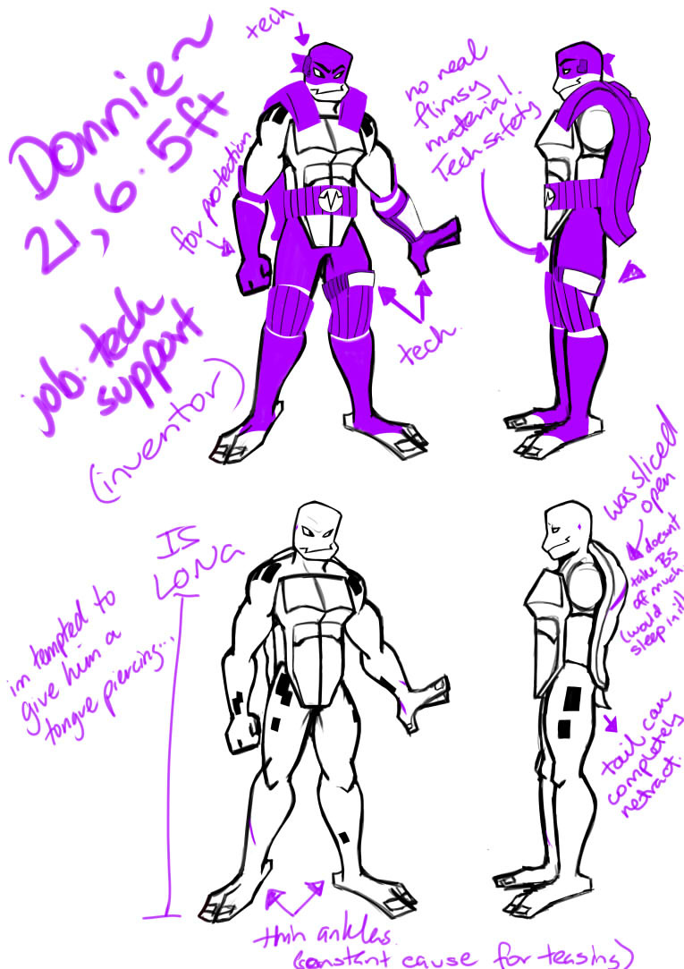 Don’s learnt his place in the team. He knows he doesn’t have to prove himself anymore. Donnie’s more Don than he’s ever been. His main Thing is that he isn’t comfortable without his battleshell. Not even really around his brothers. He sleeps without it (and boy did that take a while to stop after he initally started, and even now he'll sleep with it when he's feeling particularly vulnerable), but if he’s awake and away from his bed then it’s on. He’s managed to combine a lot of his old shells together. draxum is the one that helped donnie implant microchips on either side of his head so he no longer needs to actively touch his "goggles". him and draxum have become close in the lab. donnie respects draxum's brains and creativity, and it's nice to have someone who knows what he's talking about and actively tells him that his work is good.