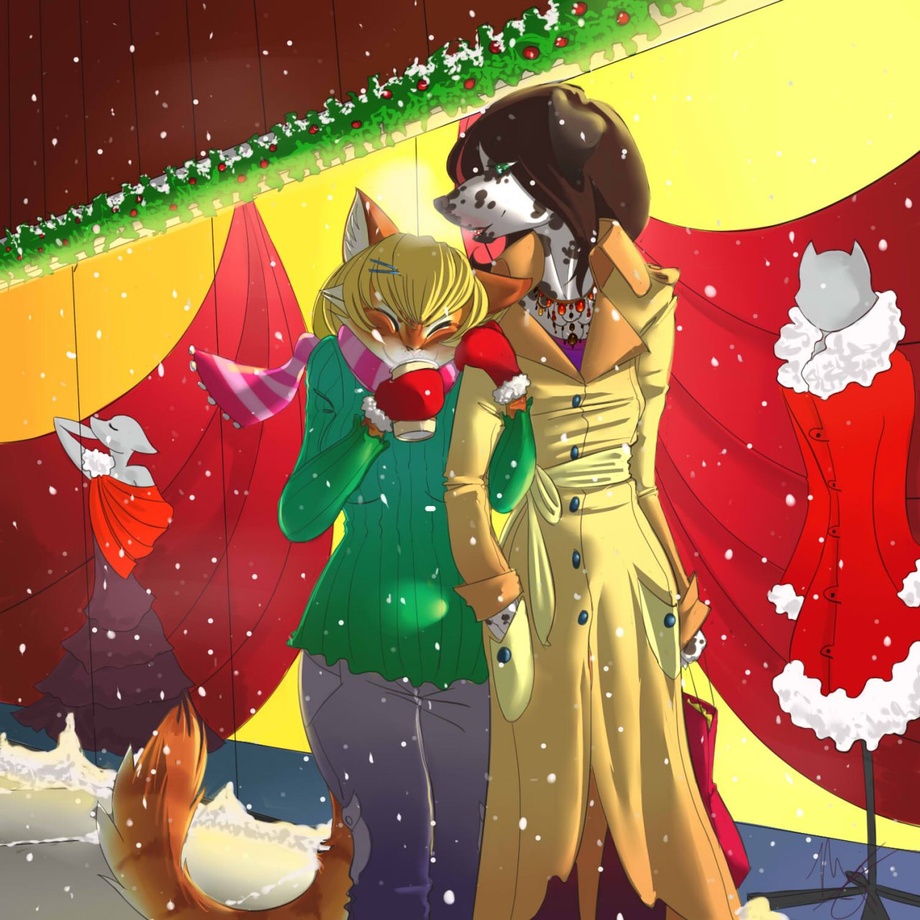 Here we have a couple enjoying themselves one night as they stroll infront of the shops in the gentle snow.