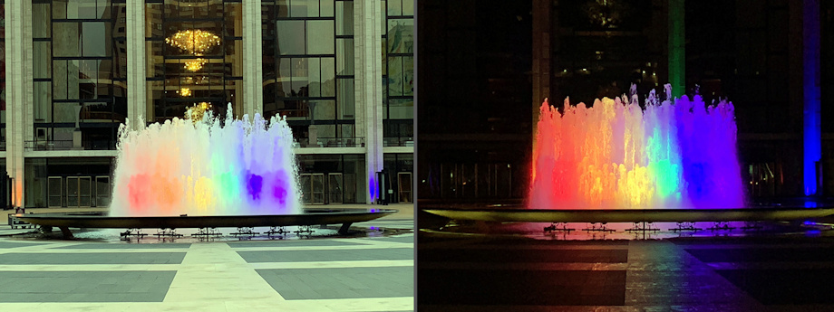 Day + night pics of the fountain in the plaza of Lincoln Center taken today (June 15, 2020), the day the U.S. Supreme Court ruled that the LGBTQ community has the same protections under the law as anyone else.