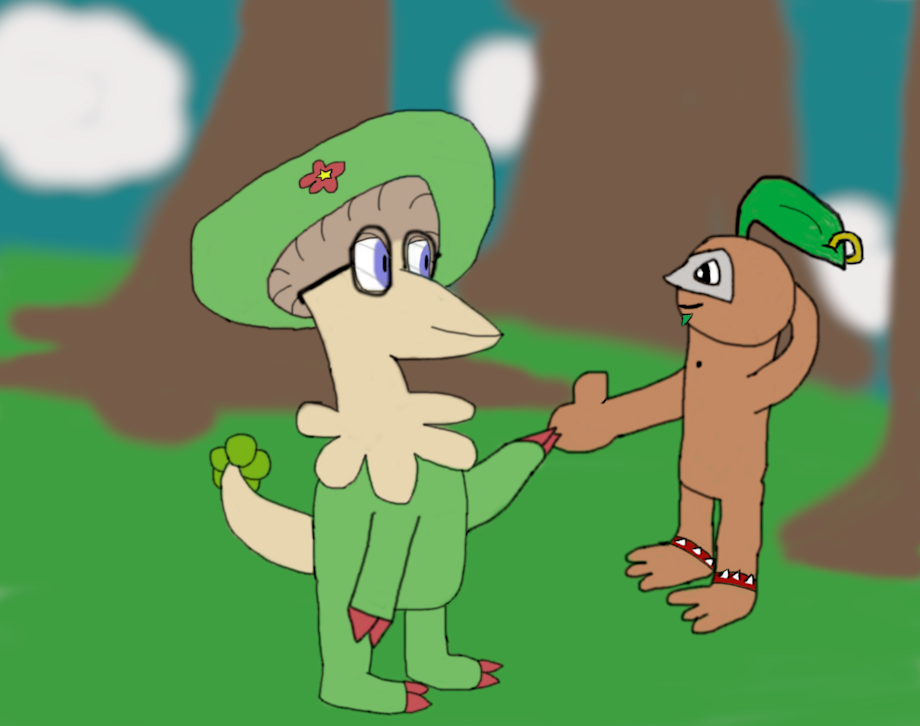 It has been days since I have been going on my own and since then nothing happens since my last entry. I have been surviving quite well. Till today I went through a forest and a Nuzleaf appears in front of me. He a little smaller than me even tho I'm quite smaller than other Breloom. He has a small beard on his face, spike ankle cuffs on his ankles, and an earring cut through on his leaf. He said his name is Slim and we chatted and well tell my story as well as his. We quickly befriend and we hang out a little. I will stay here a little and will leave and we will meet again someday, I know I will.