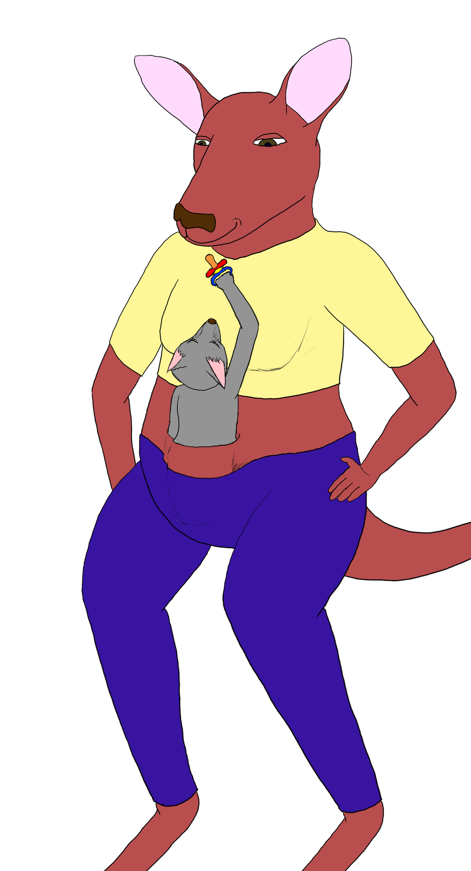 And yeah I changed the pouch design..I looked up multiple actual roos..and from what I could tell their pouch is a bit more... stretchy, it reacts more like a bag with a drawstring opening, instead of just being across the whole body..so I've got it closing nicely over the lil pup she's holding..tried to give hints that it has streatches out some..but they havn't come through too well..on the other hand a good dose of shading would probably make it much more obvious.