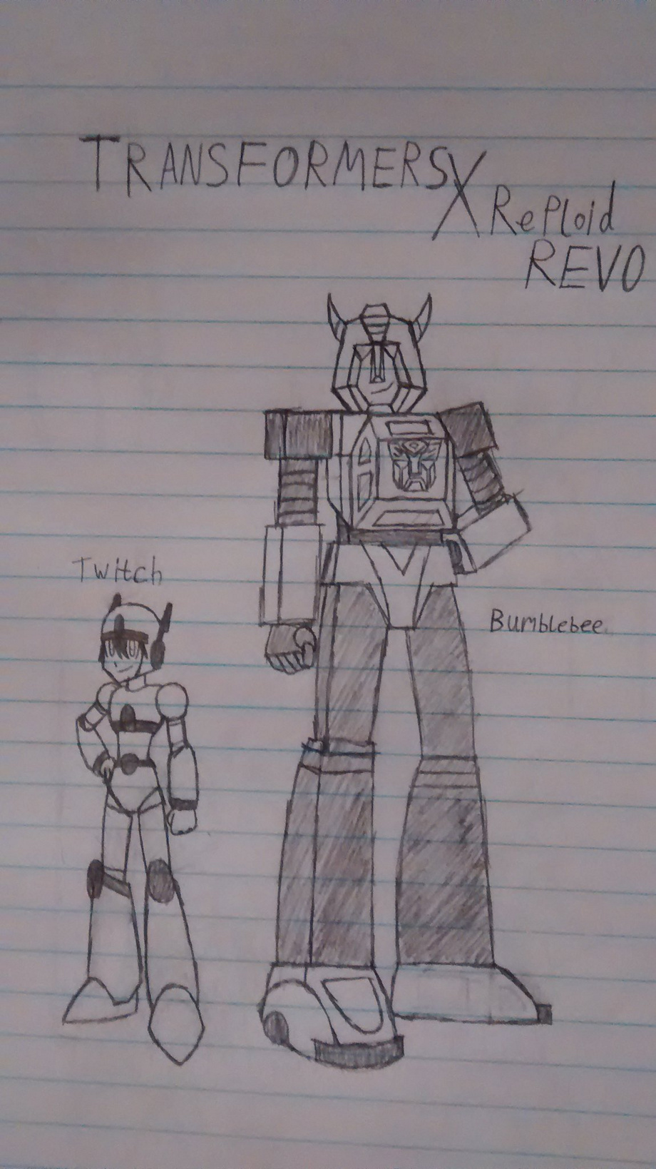 This is fan art I made for "Twitch" (aka Reploid REVO on YouTube) standing next to Bumblebee from the G1 Transformers. As stated in his video "Who Exactly Is...Twitch and Duster?" (a video I highly recommend.) he says how his character is often compared to a bumblebee, so I figured I'd make fan art for the Reploid REVO crew, Man I hope this art get's featured in the next video. I have my hopes... Enjoy.