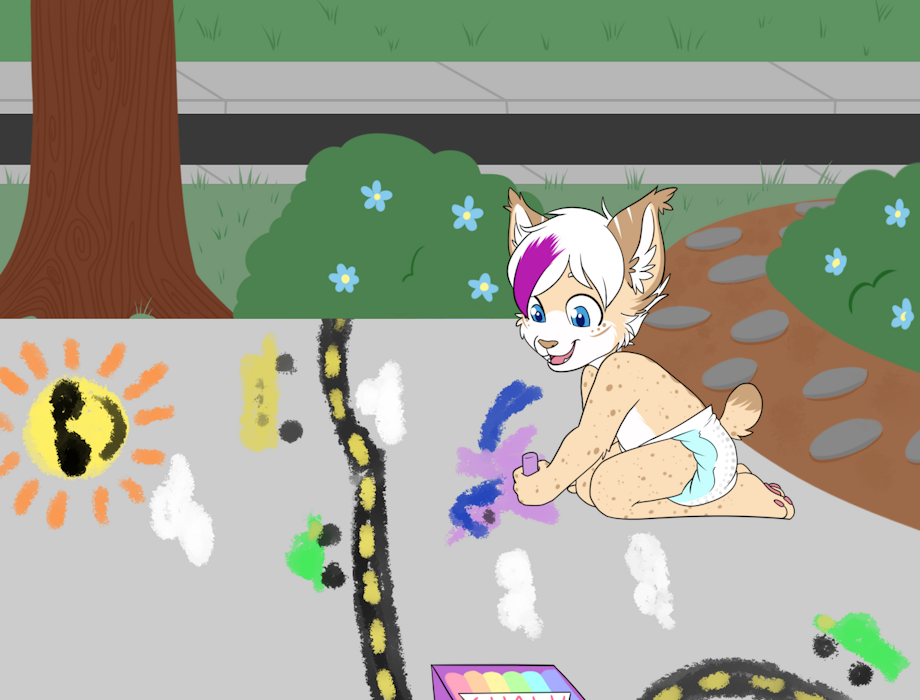 Allan loves to draw with chalk on the pavement! And he ran out instantly as he got a new pack of chalks, not even waiting until he is properly dressed, but it's a rather hot day so being outside in just a diaper is totally legit and nobody minds Allan drawing with his beloved chalks in just a diaper.